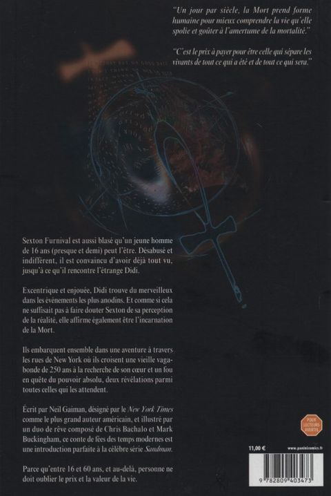 Sexton furnival est aussi blasé qu'un jeune homme de 16 ans (presque et demi) peut l'être. Désabusé et indifférent, il est convaincu d'avoir déjà tout vu, jusqu'à ce qu'il rencontre l'étrange didi. excentrique et enjouée, didi trouve du merveilleux dans les événements les plus anodins. et comme si cela ne suffisait pas à faire douter sexton de sa perception de la réalité. elle affirme également être l'incarnation de la mort. ils embarquent ensemble dans une aventure à travers les rues de new york où ils croisent une vieille vagabonde de 250 ans à la recherche de son coeur et un fou en quête du pouvoir absolu, deux révélations parmi toutes celles qui les attendent. Ecrit par neil gaiman, désigné par le new york times comme le plus grand auteur américain, et illustré par un duo de rêve composé de chris bachalo et mark buckingham, ce conte de fées des temps modernes est une introduction parfaite à la célèbre série sandman. parce qu'entre 16 et 60 ans, et au-delà, personne ne doit oublier le prix et la valeur de la vie.