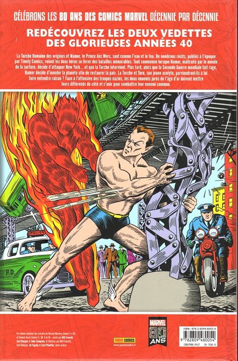 Nous fêtons cette année les 80 ans de Marvel Comics. Au travers de huit albums exceptionnels, revivez chaque décennie de l'éditeur dans une sélection d'épisodes cultes. Découvrez dans ce premier tome consacré aux années 40, l'affrontement entre Namor et la première Torche Humaine : le premier crossover entre deux héros Marvel !