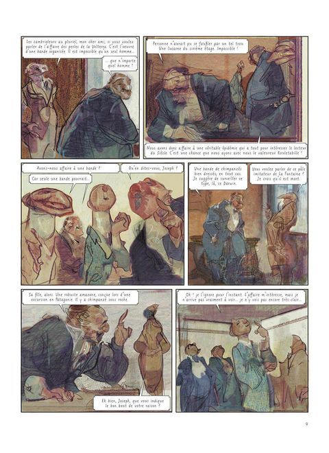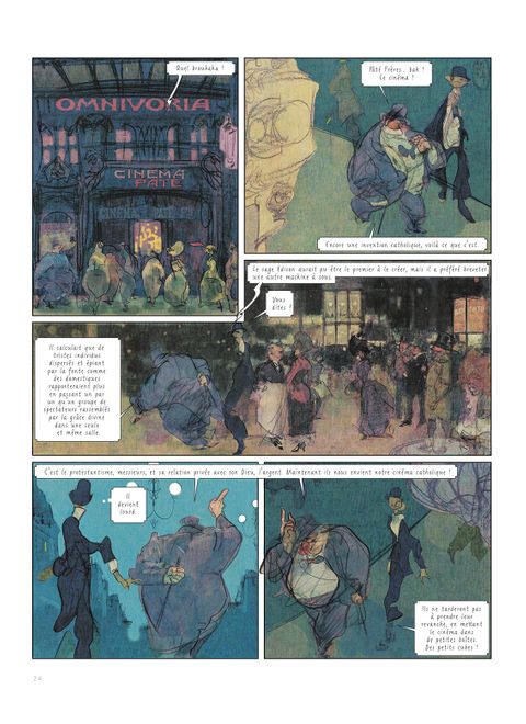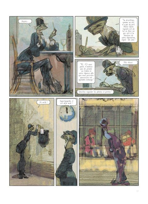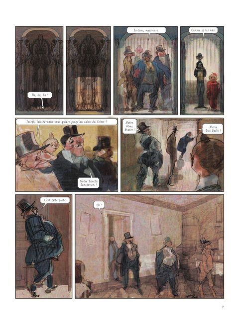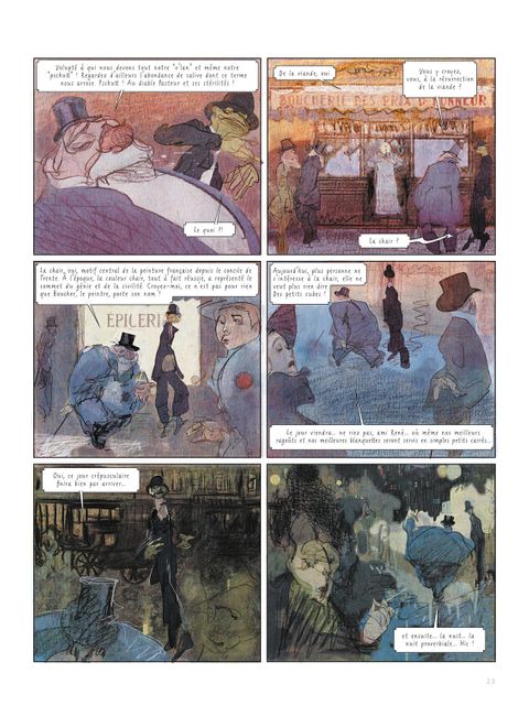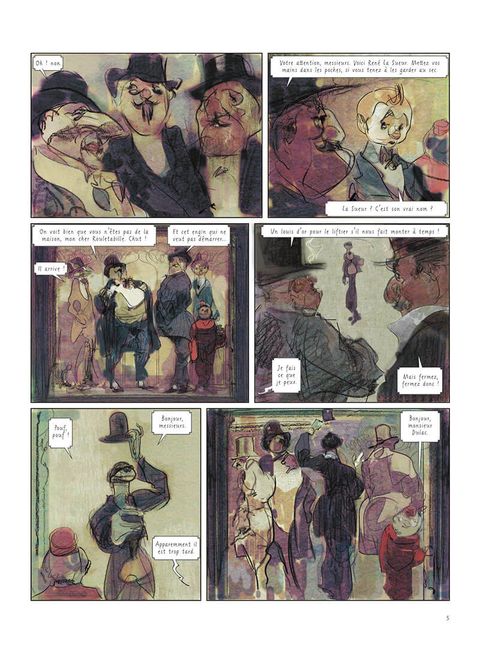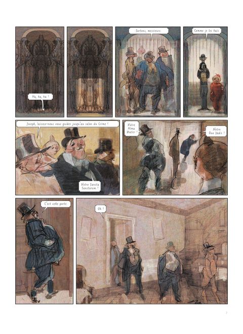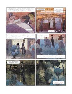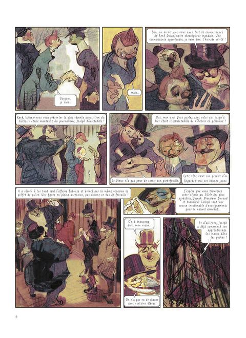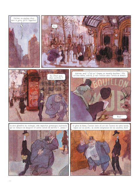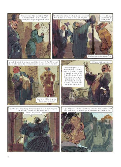 Pour sa nouvelle histoire, Lucas Nine dessine le Paris de la Belle Epoque, le Paris des impressionnistes, et cela lui sied à merveille. René Dulac, chroniqueur mondain du quotidien Le Siècle va de fil en aiguille découvrir qu'une bande criminelle parisienne conduit ses opérations macabres depuis le cabaret du Gai Cochon. Encore en fois, l'auteur argentin régale avec son dessin qui rend hommage à Honoré Daumier, en utilisant le trait de crayon avec du fusain pour donner une sensation de volume et une ambiance pastel. Lucas Nine déroule cette comédie humaine en multipliant les références à la culture française, de La Vache qui rit à Gaston Leroux, en passant par Le Cochon danseur, un film muet français burlesque sorti en 1907.