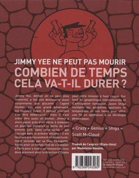 Quatrième et dernier volume de la série de Jason Shiga, cet épisode vient clore les aventures à travers l'espace et le temps de Jimmy Yee, démon immortel. Jason Shiga nous a réservé une fin aussi haletante que surprenante...