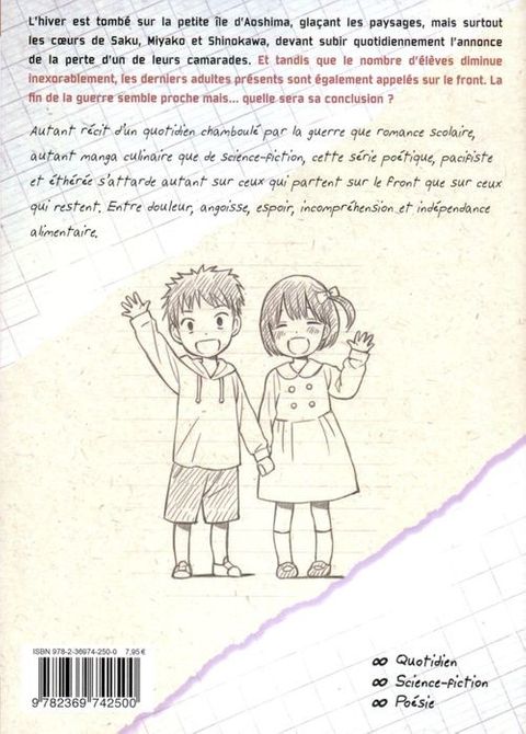 L'hiver est tombé sur la petite île d'Aoshima, glaçant les paysages, mais surtout le coeur de Saku, Miyako et Shinokawa, devant subir quotidionnement l'annonce de la perte d'un de leurs camarades. Et tandis que le nombre d'élève diminue inexorablement, les derniers adultes présents sont également appelés sur le front. La fin de la guerre semble proche mais... quelle sera sa conclusion ?