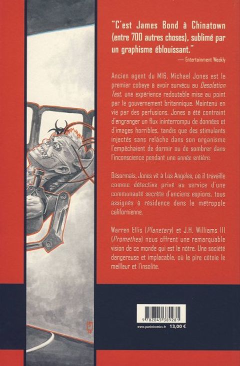 ancien agent du mi6, michael jones est le premier cobaye à avoir survécu au desolation test, une expérience redoutable mise au point par le gouvernement britannique. maintenu en vie par des perfusions, jones a été contraint d'engranger un flux ininterrompu de données et d'images horribles, tandis que des stimulants injectés sans relâche dans son organisme l'empêchaient de dormir ou de sombrer dans l'inconscience pendant une année entière. désormais, jones vit à los angeles, où il travaille comme détective privé au service d'une communauté secrète d'anciens espions, tous assignés à résidence dans la métropole californienne. warren ellis (planetary) et j.h. williams iii (pramethea) nous offrent une remarquable vision de ce monde qui est le nôtre. une société dangereuse et implacable, où le pire côtoie le meilleur et l'insolite.