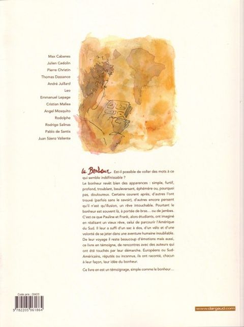Six auteurs représentant la fine fleur de la bande dessinée franco-belge (Juillard, Christin, Lepage, Cabanes, Leo et Rodolphe) ont réalisé 4 histoires de 4 pages sur le thème du bonheur. Quatre auteurs sud-américains se sont joints à eux sur le même sujet, proposant ainsi des témoignages touchants et personnels. A noter qu'Emmanuel Lepage a signé la couverture de cet album unique et universel réalisé à l'initiative de deux jeunes étudiants ""globe trotters"" qui ont sillonné l'Amérique du Sud pendant plusieurs mois. Le bonheur n'a pas de frontière !