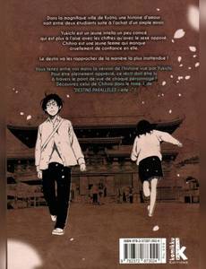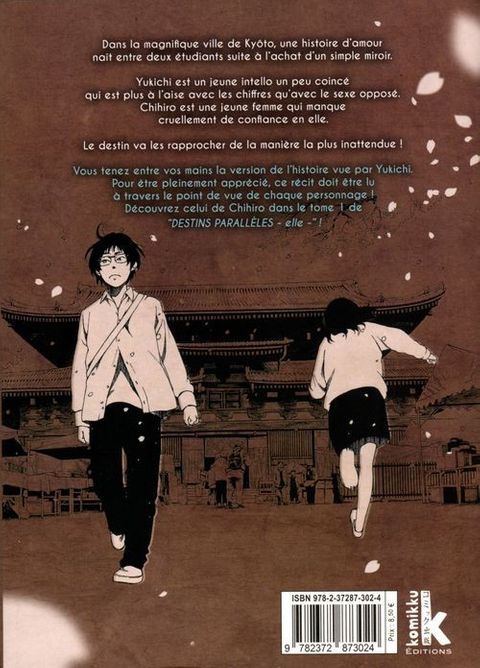 Dans la magnifique ville de Kyôto, une histoire d'amour naît entre deux étudiants suite à l'achat d'un simple miroir. Yukichi est un jeune intello un peu coincé qui est plus à l'aise avec les chiffres qu'avec le sexe opposé. Chihiro est une jeune femme qui manque cruellement de confiance en elle. Le destin va les rapprocher de la manière la plus inattendue ! DESTINS PARALLÈLES est une expérience unique ! Une histoire d'amour est racontée selon le point de vue de chaque personnage ! Découvrez la version «ELLE» et la version »LUI» !!
