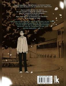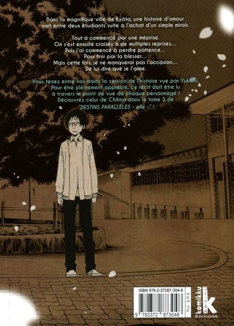 Dans la magnifique ville de Kyôto, une histoire d'amour naît entre deux étudiants suite à l'achat d'un simple miroir. Chihiro est une jeune femme qui manque cruellement de confiance en elle. Yukichi est un jeune intello un peu coincé qui est plus à l'aise avec les chiffres qu'avec le sexe opposé. Le destin va les rapprocher de la manière la plus inattendue ! Vous tenez entre vos mains la version de l'histoire vue par Yukichi. Pour être pleinement apprécié, ce récit doit être lu à travers le point de vue de chaque personnage ! Découvrez celui de Chihiro dans le tome 1 de «DESTINS PARALLÈLES - elle -» !