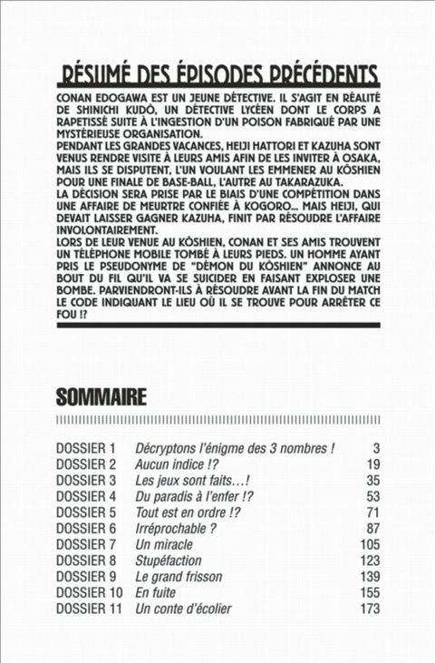 Lors d'une visite au stade Kôshien, Conan et ses amis trouvent un téléphone mobile tombé à leurs pieds. Au bout du fil, un homme ayant pris le pseudonyme de ""Démon du Kôshien"" annonce qu'il va se suicider en faisant exploser une bombe. Parviendront-ils à