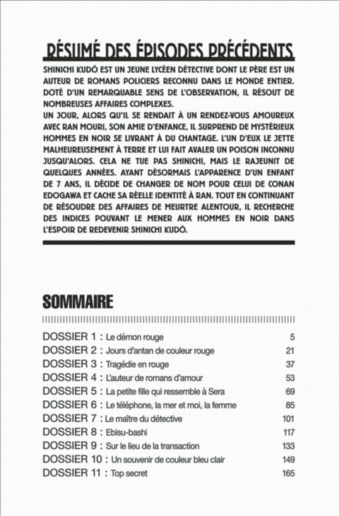 Imaginez un Sherlock Holmes moderne, âgé d'à peine 17 ans, vivant à la fin des années 1990! Comme si cela ne suffisait pas, imaginez en outre qu'il a l'apparence d'un petit garçon de 6 ans. Quand le style du Britannique Conan Doyle se conjugue avec celui du Nippon Edogawa Rampo, cela donne naissance à Conan Edogawa, le détective le plus futé de sa génération! Victime d'une mystérieuse organisation d'hommes en noir qui l'ont empoisonné et l'ont ainsi fait redevenir un enfant, cet adolescent se retrouve contraint de retourner à l'école primaire et, tout en veillant à ce que le secret de sa nouvelle identité soit préservé, il mène des enquêtes et résout des affaires ténébreuses et autres meurtres inexpliqués.