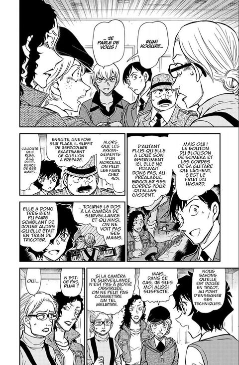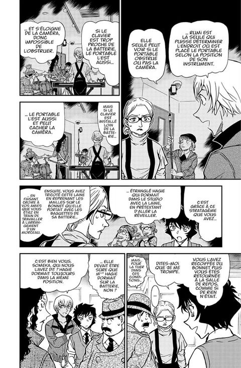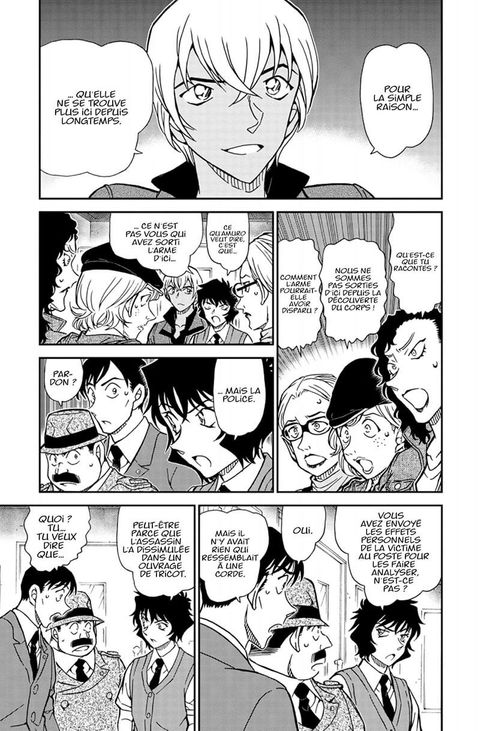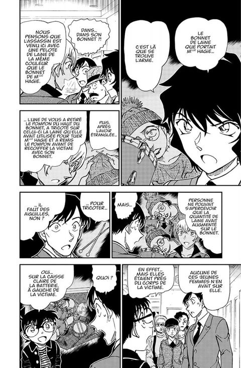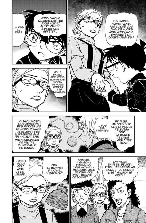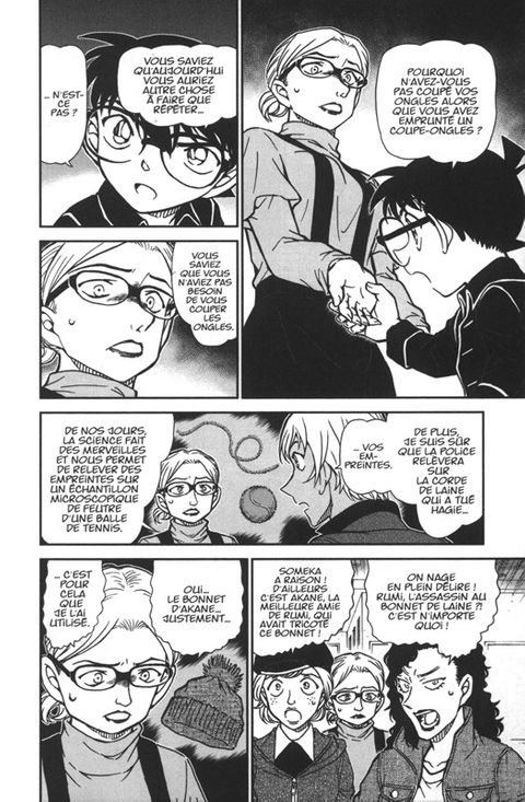 Le meurtre de Mlle Hagie est sur le point d'être résolu ! La corde qui aurait servi à la tuer aurait été dissimulée dans son bonnet, en re tricotant par dessus. Bien sur, personne n'avait remarqué l'augmentation de la quantité de laine sur le bonnet. Maintenant que la police sait le comment, ils vont devoir trouver le coupable. Conan pourrait bien avoir sa petite idée...