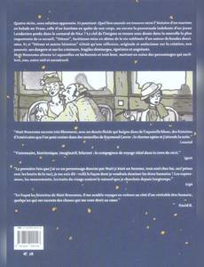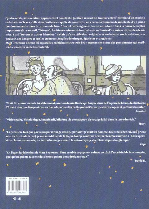 Quatre récits, sans relation apparente. Et pourtant. quel lien saurait-on trouver entre l'histoire d'un touriste en balade au texas, celle d'un fantôme en quête de son corps, ou encore la promenade indolente d'un jeune londonien perdu dans le carnaval de nice ? la clef de l'énigme se trouve sans doute dans la nouvelle la plus importante de ce recueil, "détour", facétieuse mise en abîme de la vie sublimée d'un auteur de bandes dessinées. et ,si "détour et autres histoires" n'était qu'une réflexion, originale et audacieuse sur la création, son pouvoir, ses dangers et sur les créateurs, fragiles démiurges, égotistes et angoissés. Matt broersma alterne ici aquarelles en bichromie et trait brut, mettant en scène des personnages qui oscillent, eux, entre réel et surnaturel. "matt broersma raconte très librement, avec un dessin fluide qui baigne dans de l'aquarelle bleue, des histoires d'américains que l'on peut croiser dans des nouvelles de raymond carver ; le charme opère et j'attends la suite. " loustal "visionnaire; histrionique, imaginatif, hilarant ; le compagnon de voyage idéal dans la terre du récit. " igort "la première fois que j'ai vu un personnage dessiné par matt (c'était un homme, tout seul chez lui, aux prises avec les bruits de la rue), je me suis dit : voilà la façon dont je voudrais dessiner les êtres humains! les expressions les mouvements, les traits du visage avaient le naturel que je cherchais depuis longtemps. " gipi " en lisant les histoires de matt broersma, il me semble voyager en voiture au côté d'un véritable être humain, quelqu'un qui me raconte des choses qui me vont droit au coeur. " david b.