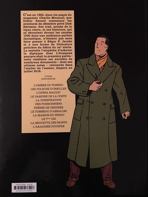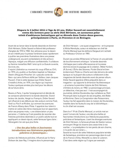 Lorsque dick hérisson découvre une mystérieuse prophétie de saint césaire selon laquelle son ultime successeur, l'archevêque d'arles du lau, doit mourir de mort violente, il est un peu tard pour avertir l'intéressé. Le 6 septembre 1792, cent quinze membres du clergé réfractaire détenus au cloître des carmes étaient massacrés à l'arme blanche. du lau était du nombre. en revanche, quand hérisson se retrouve au beau milieu des émeutes de février 1934, ces événements ne se sont pas encore produits ! seul un fil ténu relie ces deux drames historiques. un fil d'araignée. une araignée pourpre !.