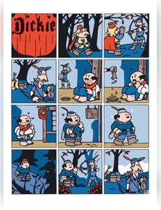 Les lecteurs de Ferraille illustré connaissent désormais bien les histoires de l'auteur flamand Pieter de Poortere qui mettent en scène un gros fermier moustachu : Dickie. Dans son premier album, édité par Bries en Belgique, Dickie était mis en scène dans sa ferme avec sa femme et ses animaux. Dans le second volet il se confrontait à l'absurde réalité qui anime situations et contextes internationaux. Pour ce troisième opus - le premier édité en France -, Dickie revisite et parcourt l'histoire de l'humanité, des premiers émois d'Adam et Ève aux sex-shops extra-terrestre du futur. Ces aventures, plus souvent méchantes que bêtes, Pieter De Poortere nous les conte avec un trait simple et une narration volontairement naïfs au service d'un humour noir implacable.