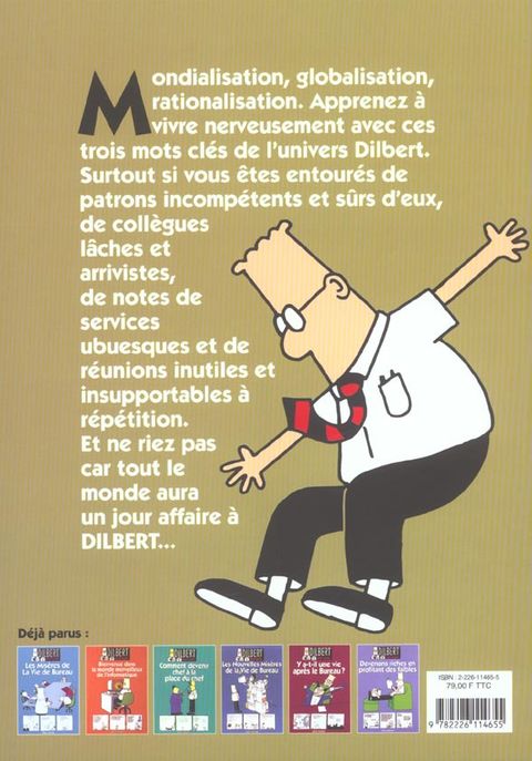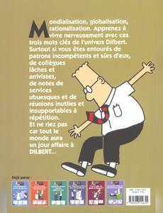 Mondialisation, globalisation, rationalisation. Apprenez à vivre nerveusement avec ces trois mots clés de l'univers Dilbert. Surtout si vous êtes entourés de patrons incompétents et sûrs d'eux, de collègues lâches et arrivistes, de notes de service ubuesques et de réunions inutiles et insupportables à répétition. Et ne riez pas car tout le monde aura un jour affaire à Dilbert...