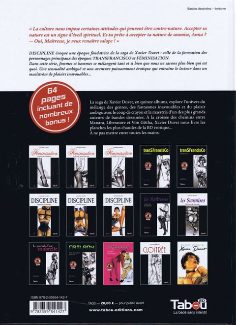 Xavier aime illustrer la relation domination-soumission, du transgenre, de ses dérives, ses fantasmes. Il a ainsi créé tout un univers qu'il développe dans plusieurs séries qui s'entrecroisent. Avec son style très réaliste et la mise en couleurs à l'aérographe, la série Discipline retrace les débuts de ses personnages principaux que l'on retrouve, plus tard, dans TranSFrancisCo ou Féminisation. En trois volumes, Discipline nous entraîne dans l'époque fondatrice de sa saga. Une série devenue mythique qui d'après son lectorat est «LA référence en matière de SM».