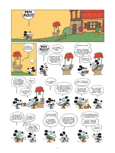 Norbert, l'arrière-petit neveu de Mickey, est comme tous les gamins de son âge : le nez toujours plongé dans sa console de jeux vidéo. Alors, pour attirer son attention, son arrière grand- oncle a l'habitude de lui raconter des histoires. Mais pas n'importe lesquelles : celles qu'il a vécues dans sa jeunesse. De palpitantes aventures dans lesquelles il a tour à tour été : cowboy, prisonnier dans le Bayou, as de l'aviation de la Première Guerre Mondiale, trafiquant de chocolat pendant la prohibition et même astronaute ! Norbert a un peu de mal à croire à ces récits invraisemblables, d'autant que, comme toutes les personnes âgées, pépé Mickey (comme l'appelle Norbert) a la vue qui baisse et la mémoire un peu comme un gruyère... Tébo, co-créateur de Captain Biceps et probablement l'un des dessinateurs de gags les plus doués de sa génération, imagine dans un dialogue entre pépé Mickey et son arrière petit neveu la jeunesse de la plus célèbre des souris. Retrouvez cinq histoires courtes dans lesquelles il revisite le monde de Mickey de son trait moderne et débordant d'idées, et où humour et aventure sont évidemment au rendez-vous !