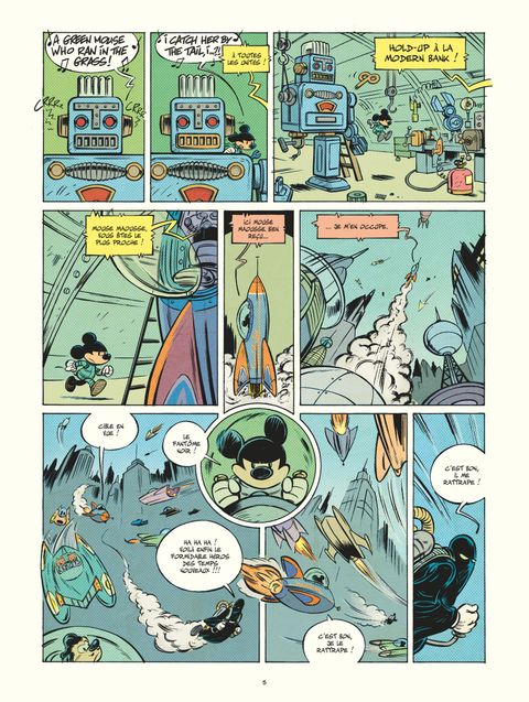 Vivez dès aujourd’hui dans le monde de demain !À New-Mickeyville, la ville rétro-futuriste, c'est l'alerte : le Fantôme noir vient de dévaliser la Modern Bank ! En un temps record, le ranger Mickey interpelle le bandit et le fait passer en jugement. Incarcéré illico à la « 100-T », la prison spatiale la mieux gardée de la galaxie, le Fantôme noir est ravi : son plan machiavélique a marché. Il fait évader les détenus les plus dangereux de la planète - Pat Hibulaire, les Rapetou, Spectrus et Laurent Outang - et crée L'Alliance maléfique ! Pour contrer ces bandits qui projettent de contrôler la ville grâce à un robot géant, Mickey réunit à son tour ses plus proches amis, Dingo, Minnie et Donald. La Space Ranger Force est née et un combat de titans se profile à l'horizon... Johan Pilet, au dessin, et Nicolas Pothier, au scénario, offrent au lecteur un album plein d'humour et de rebondissements dans un style franco-belge aux couleurs vintage.