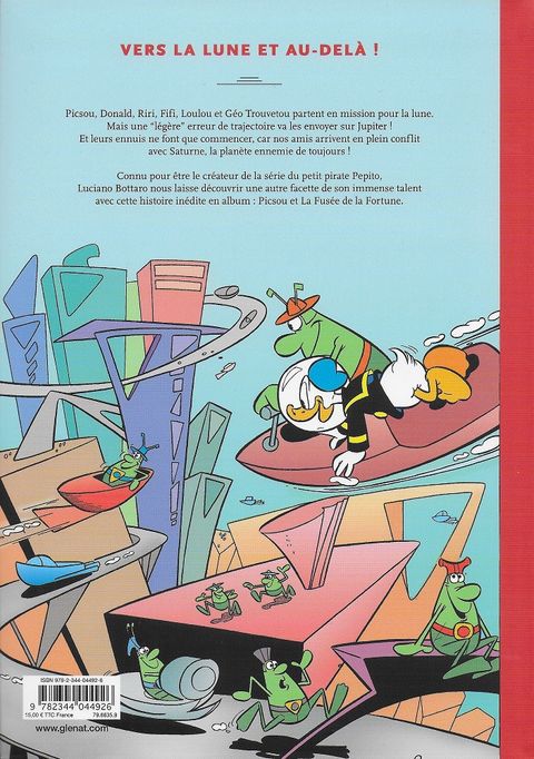 Objectif Jupiter.Luciano Bottaro est connu du public français pour être l'auteur des aventures du petit pirate Pépito (en cours de réédition chez Cornélius). Mais il est aussi un des grands maîtres italiens qui s'est essayé avec succès à l'animation des personnages de Disney.Ce recueil regroupe 3 histoires inédites en album en France dont la formidable Fusée de la fortune qui voit Picsou se réfugier sur Jupiter pour cacher sa fortune et échapper aux Rapetou.