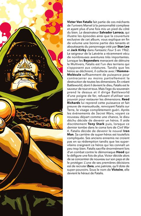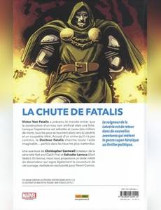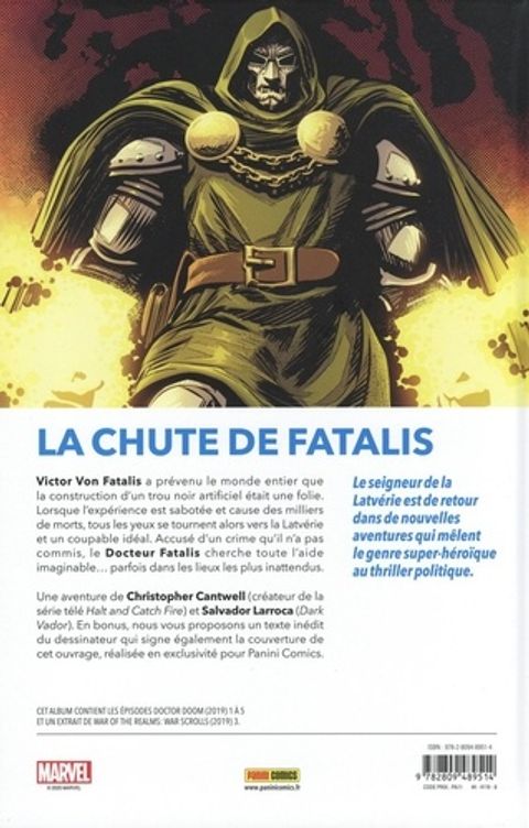 Les plus grands scientifiques de la Terre ont organisé un événement d'une ampleur sans précédent : la création d'un trou noir artificiel. Fatalis s'oppose publiquement à l'expérience qu'il estime trop dangereuse. Aussi, lorsqu'une explosion tue des milliers d'innocents, le seigneur de la Latvérie devient le principal suspect d'un crime qu'il n'a pourtant pas commis... Les débuts d'une série régulière consacrée à Fatalis, l'ennemi des Quatre Fantastiques et des Avengers. Elle est signée Christopher Cantwell, créateur de la série Halt and Catch Fire (diffusée sur Canal+) et Salvador Larroca (Uncanny X-Men). Contient les épisodes US : • Doctor Doom (2019) #1-5, • Un extrait de War of the Realms: War Scrolls (2019) #3.