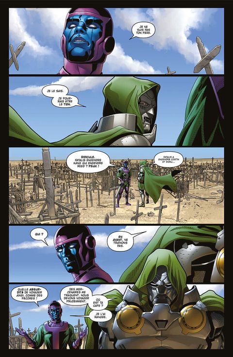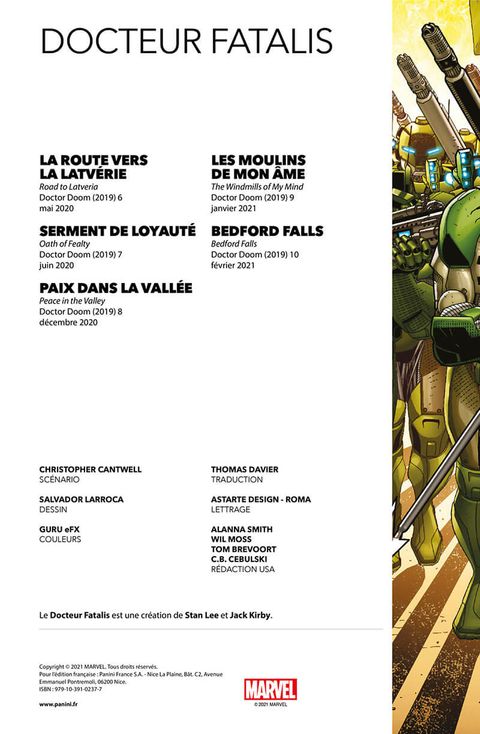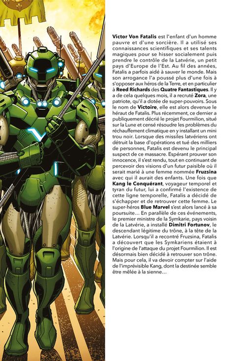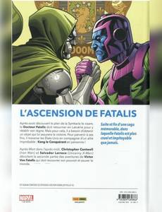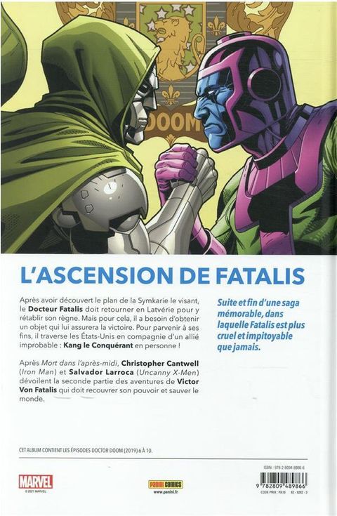 Afin de reconquérir la Latvérie après le coup d'état de la Symkarie, le Docteur Fatalis est prêt à s'allier à Kang le Conquérant, pour mettre la main sur l'une des armes les plus puissantes de l'univers Marvel ! Ensuite, va-t-il se venger ou s'occuper du trou noir apparu sur la Lune, qui menace d'avaler tout le système solaire ? La quête de Victor Von Fatalis pour devenir un héros s'achève ici ! Christopher Cantwell (Iron Man) conclut sa série consacrée à Victor Von Fatalis en mettant un point final à la période du gentil Fatalis, inaugurée par Brian Michael Bendis, à l'issue de Secret Wars. Une saga charnière pour ce personnage fort apprécié, alors qu'un film Fantastic Four signé Marvel Studios a officiellement été annoncé. Contient les épisodes US Doctor Doom (2019) #6-10.