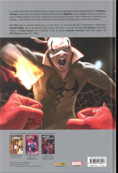 Iron Fist a ses poings d'acier et est expert en kung-fu, Scarlet Spider a les mêmes pouvoirs que Spider-Man. Ils sont tous les deux à Las Vegas alors que Méphisto prend le contrôle de la ville. Pour survivre, chacun va devoir faire face à ses propres démons, au sens propre comme au sens figuré ! Contient les traductions françaises des épisodes US suivants : - Scarlet Spider #15 à 17 - Iron Fist #78 à 80.