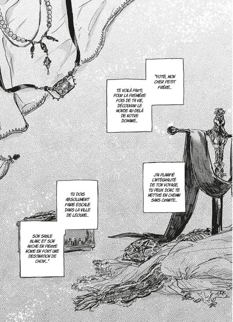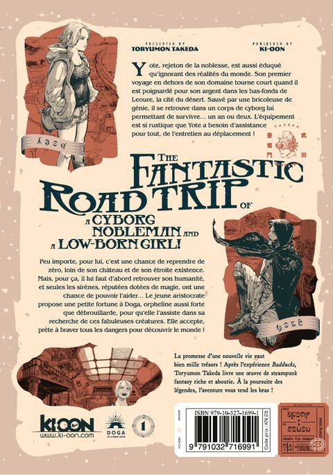 Le road trip fantastique d'un noble cyborg et d'une as du système D !Yote, rejeton de la noblesse, est aussi éduqué qu'ignorant des réalités du monde. Son premier voyage en dehors de son domaine tourne court quand il est poignardé pour son argent dans les bas-fonds de Leoure, la cité du désert. Sauvé par une bricoleuse de génie, il se retrouve dans un corps de cyborg lui permettant de survivre... un an ou deux. L'équipement est si rustique que Yote a besoin d'assistance pour tout, de l'entretien au déplacement ! Peu importe, pour lui, c'est une chance de reprendre de zéro, loin de son château et de son étroite existence. Mais, pour ça, il lui faut d'abord retrouver son humanité, et seules les sirènes, réputées dotées de magie, ont une chance de pouvoir l'aider... Le jeune aristocrate propose une petite fortune à Doga, orpheline aussi forte que débrouillarde, pour qu'elle l'assiste dans sa recherche de ces fabuleuses créatures. Elle accepte, prête à braver tous les dangers pour découvrir le monde ! La promesse d'une nouvelle vie vaut bien mille trésors ! Après l'expérience Badducks, Toryumon Takeda livre une œuvre de steampunk fantasy riche et aboutie. À la poursuite des légendes, l'aventure vous tend les bras !