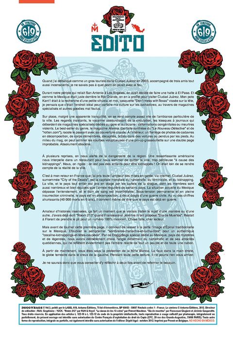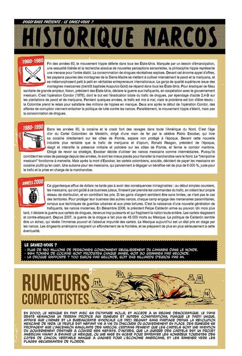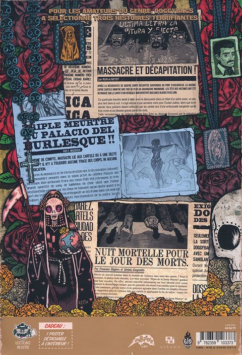 Plus brutal qu'un coup de fusil à pompe en pleine tête et plus vicieux qu'un arrachage de dent à la pince-monseigneur, DoggyBags est un hommage aux pulps et aux comics d'horreur des années 50 qui ne fait pas dans la dentelle : les chromes rugissent, les calibres crachent et l'hémoglobine coule à flots dans la joie et la mauvaise humeur. Sortez vos p'tits sacs pour toutous, parce qu'il va y avoir de la viande en rab ! Le tome 3 de DoggyBags sera muy caliente, puisque les trois histoires se dérouleront au Mexique, plus précisément à Ciudad Juarez, capitale internationale du narcotrafic et du kidnapping. Au Mexique, la vie ne vaut rien, mais elle a un prix. Au sommaire de ce DoggyBags 3: - Le chef d'un cartel hanté par les crimes qu'il a commis. - Un « Rape and Revenge » érotico-exotique sur fond de danse du voile. - La vengeance de deux flics névrosés contre le cartel le plus dangereux de la ville, le jour de la fête des morts.