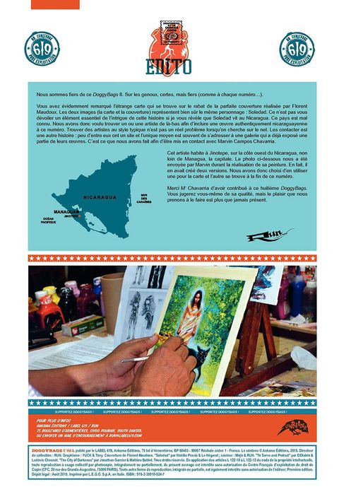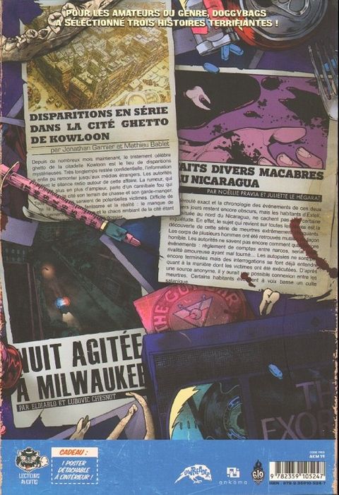 Trois histoires, trois tueries. Plus brutal qu'un coup de fusil à pompe en pleine tête et plus vicieux qu'un arrachage de dent à la pince-monseigneur, DoggyBags est un hommage aux pulps et aux comics d'horreur des années 1950 qui ne fait pas dans la dentelle. Au sommaire de ce DOGGYBAGS 8 : - Soledad, une histoire de Noëllie Pravia et Lehégarat. - To serve and protect, d'El Diablo et Luché. - The City of darkness, de Jonathan Garnier et Mathieu Bablet.