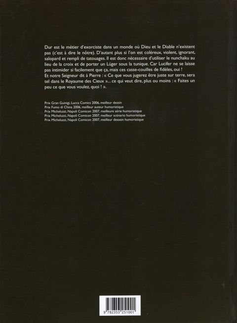 Dur est le métier d'exorciste dans un monde où dieu et le diable n'existent pas (c'est à dire le nôtre). D'autant plus si l'on est coléreux, violent, ignorant, salopard et rempli de tatouages. il est donc nécessaire d'utiliser le nunchaku au lieu de la croix et de porter un lüger sous la tunique. car lucifer ne se laisse pas intimider si facilement que ça, mais ces casse-couilles de fidèles, oui ! et notre seigneur dit à pierre : " ce que vous jugerez être juste sur terre, sera tel dans le royaume des cieux ". Ce qui veut dire, plus ou moins : " faites un peu ce que vous voulez, quoi ! ".