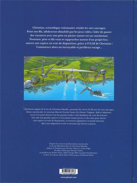 Réaliser un rêve. Tenter l'impossible. Christian, scientifique visionnaire, étudie les oies sauvages. Pour son fils, adolescent obnubilé par les jeux vidéo, l'idée de passer des vacances avec son père en pleine nature est un cauchemar. Pourtant, père et fils vont se rapprocher autour d'un projet fou : sauver une espèce en voie de disparition, grâce à l'ULM de Christian ! Commence alors un incroyable et périlleux voyage... Librement adapté de la vie de Christian Moullec, pionnier du vol en ULM avec les oies sauvages, Donne-moi des ailes, le nouveau film de Nicolas Vanier (Le Dernier trappeur, Belle et Sébastien) au cinéma le 9 octobre 2019 sera à n'en point douter l'un des grands rendez-vous familiaux de cette fin d'année. Une ode aux grands espaces et à la nature autant qu'un cri du coeur pour sauver une espèce en voie de disparition, à retrouver également en bande dessinée dans une adaptation écrite et dessinée par Steven Lejeune.
