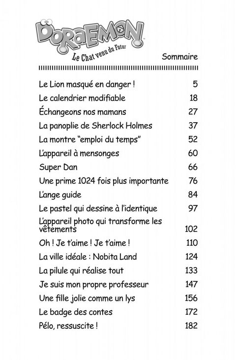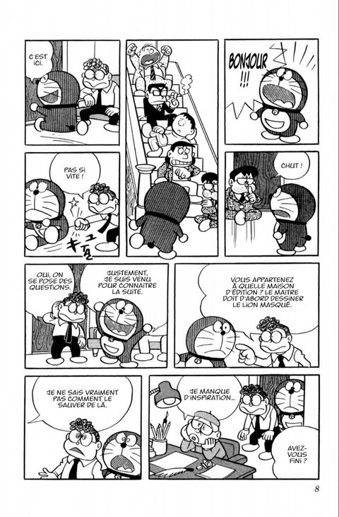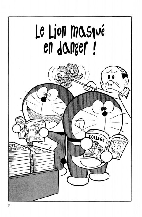 Dans la première histoire, le Lion masqué, le héro de manga préféré de Nobita, est en mauvaise posture ! Quel supplice pour Doraemon et Nobita qui ne peuvent pas se résoudre à patienter jusqu'à la prochaine publication. Doraemon décide de rendre visite à l'auteur de la série. Peine perdue, celui-ci est en panne d'inspiration. Doreamon se rend alors dans le futur pour lire la suite de l'histoire... !! Dans la foulée, nos deux compères testeront, entre autres, le ""calendrier modifiable"", ""l'appareil à mensonges"" ou ""la machine à échanger les mamans""... autant de catastrophes en perspectives !