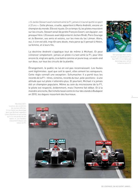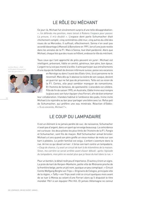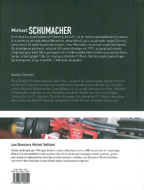 La vie, la carrière et la personnalité d'une figure mythique du sport automobile. Ce nouveau Dossier Michel Vaillant célèbre la carrière et les victoires de Michael Schumacher. Avec ses sept titres de champion du monde et ses quatre-vingt onze victoires en Grand Prix, il détient la plupart des records de Formule 1. Figure incontournable du sport automobile, il fait l'objet d'une biographie illustrée illustré de dessins, d'images de presse et de photos personnelles. En bonus, 20 pages BD et la galerie dessinée de ses voitures emblématiques. Un inédit des Dossiers Michel Vaillant