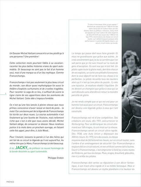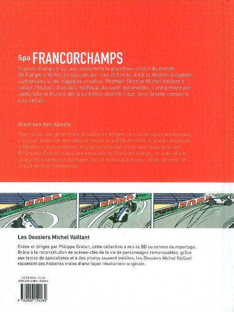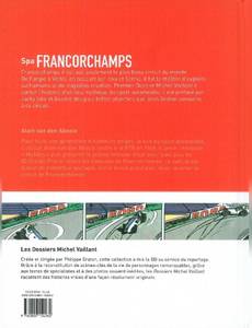 Le circuit de Spa Francorchamps fait partie des hauts lieux de la course automobile. Circuit mythique, il apparaît dans de nombreuses aventures de Michel Vaillant. Pour raconter l'histoire de ce lieu légendaire, Alain van den Abeele et Jean Graton remontent le fil de la fiction et nous invitent à la découverte des grands moments de Spa-Francorchamps. Depuis leur création, les Dossiers Michel Vaillant racontent l'histoire vraie de figures emblématiques de l'univers automobile : des pilotes (Alain Prost, Jacky Ickx, Gilles Villeneuve...), des acteurs (James Dean, Steve Mc Queen...), des industriels (Enzo Ferrari, Louis Chevrolet), et même l'humoriste Coluche. C'est maintenant au tour d'un haut-lieu de la course automobile de faire son entrée dans les Dossiers Michel Vaillant. Illustré de photos d'archives, d'images de presse et de dessins, cet ouvrage reprend de nombreux extraits des aventures de Michel Vaillant sur le circuit de Francorchamps entre 1958 et 1982.