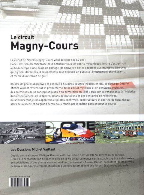 À l'occasion de ses 60 ans, le mythique circuit de Nevers Magny-Cours est au cœur d'un nouveau dossier Michel Vaillant. L'occasion de revenir sur son incroyable histoire, à démarrer par les circonstances de sa création, puisque Magny-Cours fut d'abord une piste de karting avant d'accueillir le Grand Prix de France, qui verra triompher des champions aussi légendaires que Nigel Mansell, Alain Prost, Michael Schumacher ou encore Fernando Alonso. Un circuit qui verra aussi passer Michel Vaillant et Steve Warson, dans plusieurs histoires courtes inédites où retentissent les rugissements de moteurs ! Entre bande dessinée, reportages exclusifs et photographies souvent inédites, vous êtes invités en VIP à un tour de piste étourdissant sur Magny-Cours ! Janvier et Balleret, par leur souci d'exhaustivité et de précision dans la reconstitution de l'histoire de Magny-Cours, s'inscrivent pleinement dans la tradition Graton. Un beau-livre indispensable à tout amateur de Michel Vaillant et de sport automobile en général.