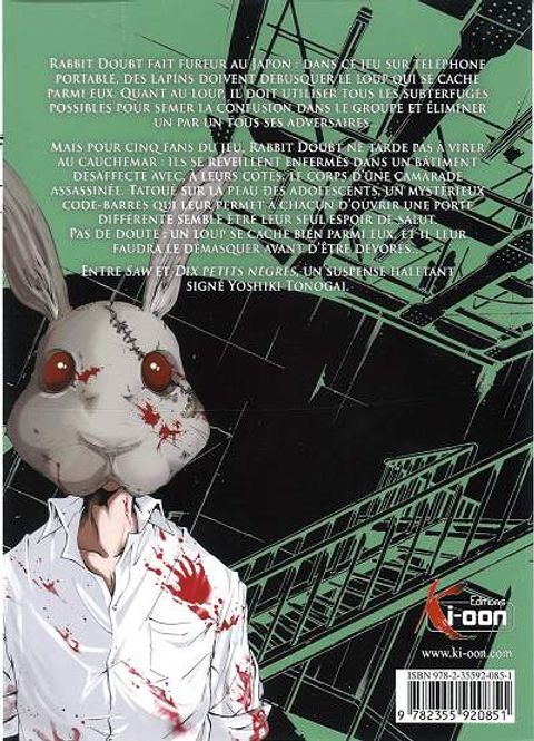 Pour Yû et ses compagnons d'infortune, la belle entente du début a laissé place à la méfiance et au soupçon. Après la fouille de tout le bâtiment, une seule chose est sûre : ils sont bel et bien enfermés, et le nombre de codes-barre à leur disposition ne cesse de diminuer... Petit à petit, le passé des joueurs commence à se dévoiler. La tension monte - tout le monde s'épie en quête d'un indice, du moindre signe qui permettrait enfin d'identifier le loup. Mais voilà que ce dernier fait une nouvelle victime...Entre Saw et Dix petits nègres, un suspense haletant signé Yoshiki Tonogai.