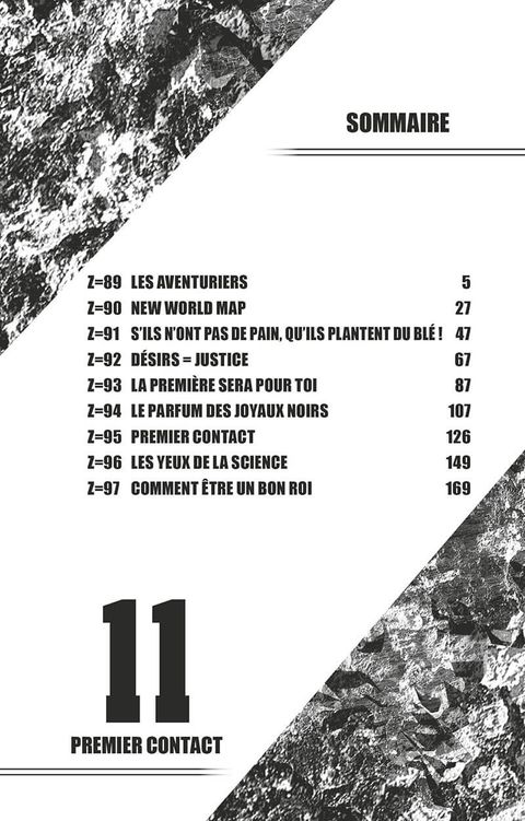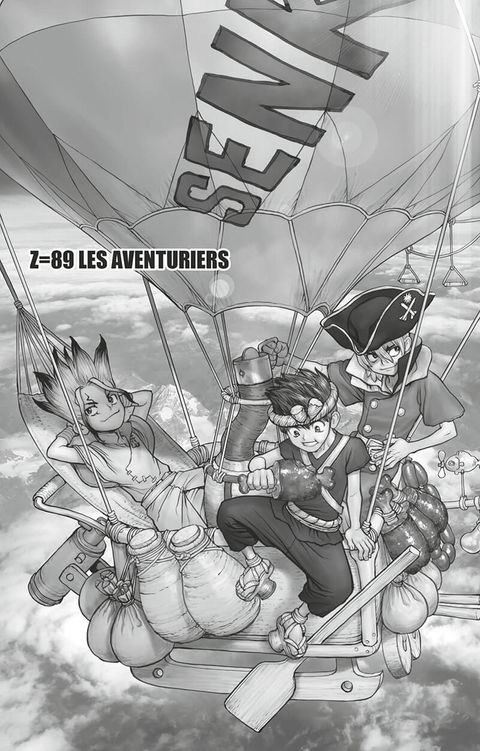 Senku et ses amis créent une carte des ressources les plus précieuses grâce à leurs recherches en montgolfière ! Avec l’augmentation de la population, la quantité de nourriture disponible devient un problème. Ils vont tenter de révolutionner leur alimentation en fabriquant un pain à la fois bon et longue conservation ! Plus tard, alors qu’ils testent un bateau en pleine mer, une rencontre inattendue va les laisser en état de choc…