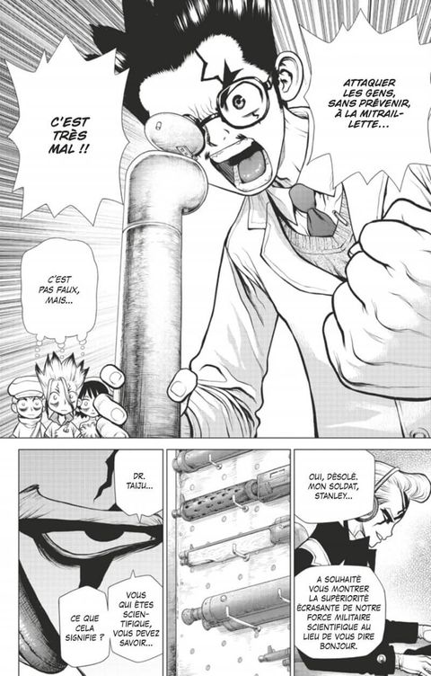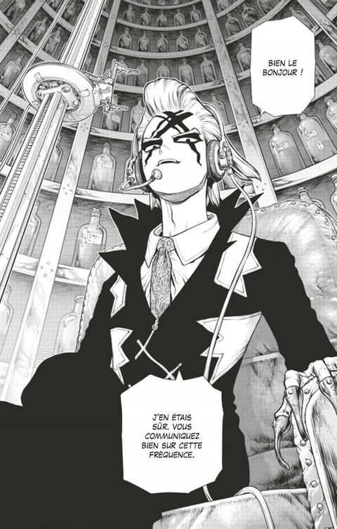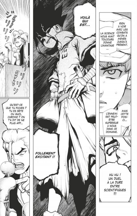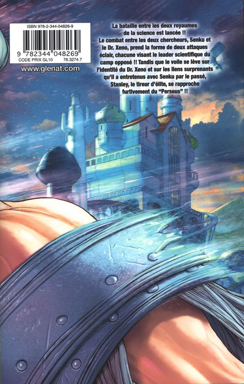 La bataille entre les deux royaumes de la science est lancée !! Le combat entre les deux chercheurs, Senku et le Dr. Xeno, prend la forme de deux attaques éclair, chacune visant le leader scientifique du camp opposé !! Tandis que le voile se lève sur l'identité du Dr. Xeno et sur les liens surprenants qu'il a entretenus avec Senku par le passé, Stanley, le tireur d'élite, se rapproche furtivement du "Perseus" !!
