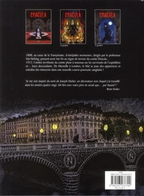 Le comte Dracula est de retour ! 1912. Vingt-cinq ans après avoir détruit le vampire en Transylvanie, ceux qui ont mis un terme à son sanglant parcours sont dispersés de par le monde, et souvent perturbés par l'aventure hors du commun qu'ils ont vécue et partagée. Or voilà qu'une mort inexpliquée devant un théâtre parisien, puis un deuxième assassinat d'une effroyable cruauté au coeur de Londres semblent tout remettre en cause. La peur s'est réveillée. Du Quartier latin à Piccadilly Circus, l'ombre du prince des ténèbres semble à nouveau planer. Suite officielle du Dracula originel de Bram Stoker, car rédigée de la plume même de son descendant Dacre Stoker (en partenariat avec Ian Holt) à partir de notes laissées par l'écrivain, Dracula l'Immortel devient une bande dessinée. L'adaptation du roman est réalisée par Michel Dufranne, et la mise en images est de Piotrek Kowalski, qui signe là sa première contribution au catalogue de Casterman. Il s'agit d'une trilogie, réalisée en co-édition avec l'éditeur Michel Lafon.