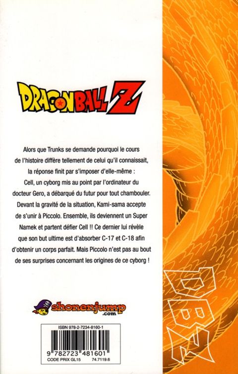 Alors que Trunks se demande pourquoi le cours de l'histoire diffère tellement de celui qu'il connaissait, la réponse finit par s'imposer d'elle-même : Cell, un cyborg mis au point par l'ordinateur du docteur Gero, a débarqué du futur pour tout chambouler. Devant la gravité de la situation, Kami-sama accepte de s'unir à Piccolo. Ensemble, ils deviennent un Super Namek et partent défier Cell !! Ce dernier lui révèle que son but ultime est d'absorber C-17 et C-18 afin d'obtenir un corps parfait. Mais Piccolo n'est pas au bout de ses surprises concernant les origines de ce cyborg !