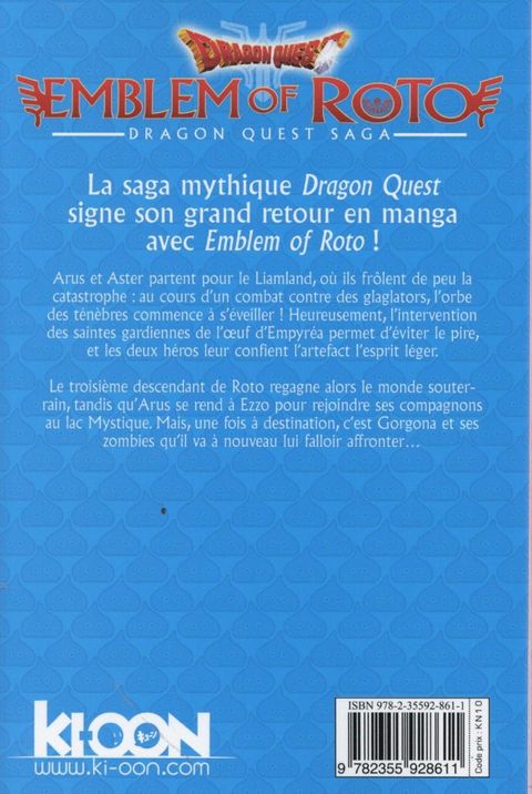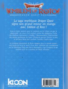 Une fois leur entraînement terminé, Arus et Kira quittent la tour des Mirages pour retrouver leurs compagnons. Le sage Kadal les charge d'une mission : retrouver les trois seigneurs, descendants des guerriers qui ont jadis combattu aux côtés du héros Roto. Mais voilà que dans la cité d'Assarahm, Lunafrea est attaquée par un mystérieux épéiste au service de l'armée du mal ! Pire, l'homme prétend être le seigneur de la Lame. Après Dragon Quest - La quête de Dai (Fly), la saga mythique signe son grand retour avec Dragon Quest - Emblem of Roto, une fabuleuse aventure qui a déjà enchanté des millions de lecteurs !