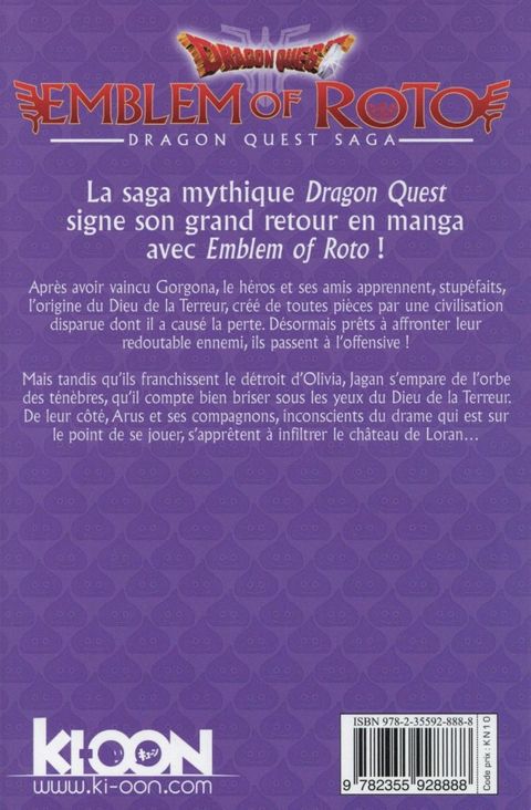 Une fois leur entraînement terminé, Arus et Kira quittent la tour des Mirages pour retrouver leurs compagnons. Le sage Kadal les charge d'une mission : retrouver les trois seigneurs, descendants des guerriers qui ont jadis combattu aux côtés du héros Roto. Mais voilà que dans la cité d'Assarahm, Lunafrea est attaquée par un mystérieux épéiste au service de l'armée du mal ! Pire, l'homme prétend être le seigneur de la Lame. Après Dragon Quest - La quête de Dai (Fly), la saga mythique signe son grand retour avec Dragon Quest - L'Emblème de Roto, une fabuleuse aventure qui a déjà enchanté des millions de lecteurs !