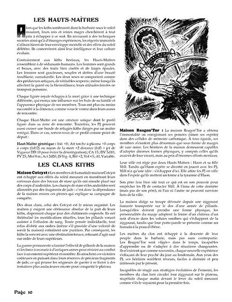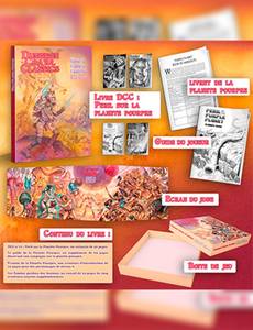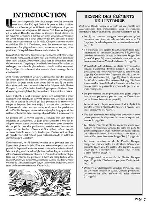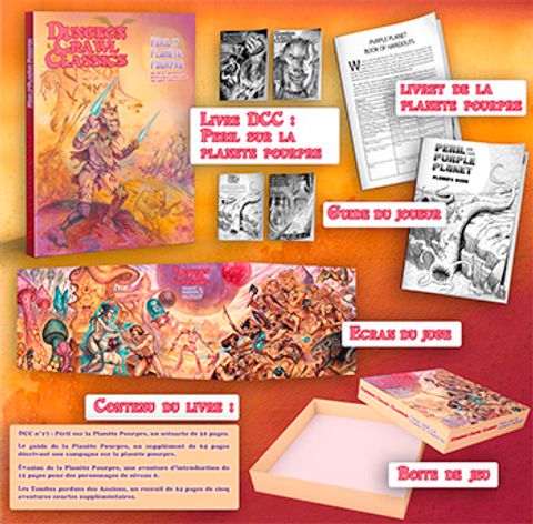 La Planète Pourpre : où des tribus d’hommes-bêtes mènent une guerresans fin sous un soleil mourant. Où les impressionnant vers de la mortrègnent sur les étendues désertiques, où des vents mauvais sifflent dansdes cryptes oubliées et où des forêts de champignons prospèrent sous unelumière malade. Où des technologies oubliées offrent la vie… ou une mortrapide. Privés de patron, d’amis ou de dieu, votre survie dépend de votreruse et d’une épée solide. Vos compagnons et vous vous transformorezvousen cnquérants de cette terre étrangère? Où tomberez-vous sous lefeu d’un rayon de mort noire, simple cadavre supplémentaire abandonnésur les terres désolées de la Planète Pourpre?