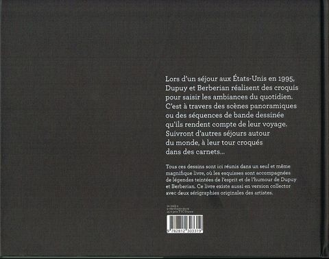 Lors d'un séjour aux États-Unis en 1995, Dupuy et Berberian, le célèbre duo de Fluide glacial, réalisent des croquis pour saisir les ambiances du quotidien. C'est à travers des scènes panoramiques ou des séquences de bande dessinée qu'ils rendent compte de leur voyage. Suivront alors d'autres séjours (Lisbonne, Tanger, Istanbul...) à leur tour croqués dans des carnets. Tous les croquis sont ici réunis dans un seul et même magnifique livre où les esquisses sont accompagnées de légendes teintées de l'esprit et de l'humour Dupuy-Berberian. Les amateurs de BD prendront plaisir à découvrir ses deux dessinateurs stars sous un jour nouveau !