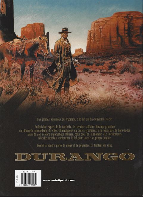 Les plaines sauvages du wyoming, à la fin du dix-neuvième siècle. Redoutable expert de la gâchette, le cavalier solitaire durango promène sa silhouette nonchalante de villes-champignons en postes frontières, à la poursuite de hors-la-loi. muni de son célèbre mauser, celui que l'on surnomme " le pacificateur " n'hésite jamais à contourner la loi pour servir sa propre justice. quand la poudre parle, la neige et la poussière se teintent de sang.