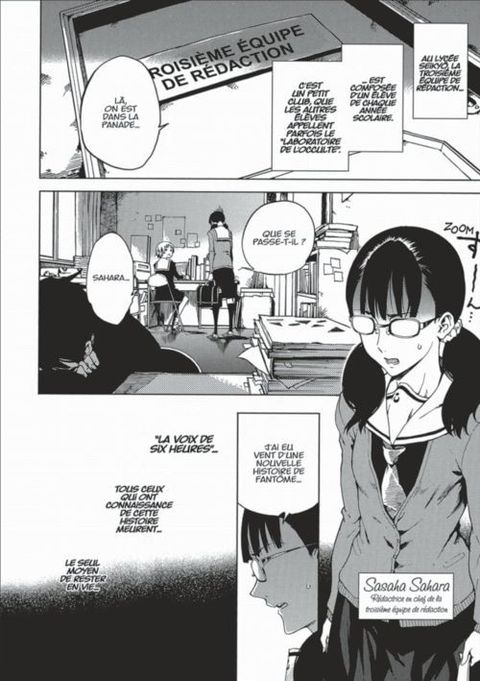 Le collège Seikyô est en proie à une nouvelle histoire de fantôme : « La voix de six heures » ! Les étudiants qui en entendent parler se retrouvent obligés de raconter cette histoire à d'autres, sous peine de mourir ! L'équipe d'enquête se lance donc à la recherche de la personne qui est à l'origine de cette histoire. Plus facile à dire qu'à faire...