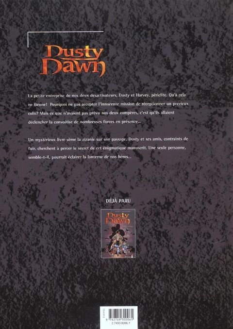 « Un vampire squatte votre cave ? Des zombies piétinent vos plates-bandes ? Un poltergeist fait du tapage nocturne ?... Appelez Dusty Dawn et son associé Harvey le gandlin qui vous débarrasseront des importuns paranormaux. Service rapide. Facilités de paiement. »Dusty est maintenant en possession de manuscrit de Kellios. Aussi appelé « Livre de la Création », il aurait permis à Dieu de créer l'Univers, la Terre et toutes les entités qui l'habitent. Dérobé par Lucifer qui ne parvint pas à l'emmener en Enfer, ce livre, dont les pouvoirs sont inimaginables, fut recherché par Jésus sans résultat.Et maintenant, tout le monde veut récupérer le livre et avoir la peau de Dusty Dawn : le padre Müller, chef du Vatican, Don Casoni, patron de la mafia, le maire de Néo-Callisto, la belle et dangereuse Elizabeth Van-Nuithen, et toute une horde de vampires et autres démons sanguinolents... Bon courage, Dusty..."Dusty Dawn" est une sacrée réussite ! Un scénario en béton, un dessin dynamique et réjouissant, un découpage savamment orchestré, de l'action, du suspense, de la violence, de l'humour... Mais que demander de mieux ?...