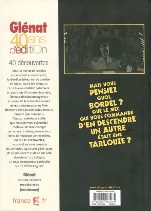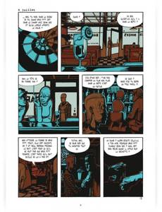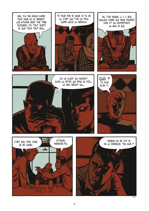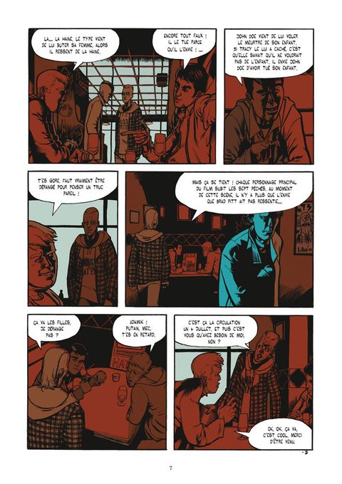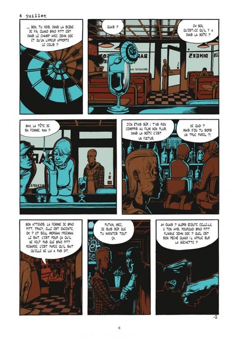 Un polar glauque et déjanté dans lequel rôdent les ombres de Tarantino et des frères Coen. Neil est un flic triste. Sa femme le trompe. Sa fille traîne avec de mauvaises fréquentations, comme on dit dans les bonnes familles. Quant à lui, il traîne une déprime et une boulimie maladive liées à une série d'homicides non résolus dans une ancienne ville, une ancienne vie. Mais alors que Neil pense se refaire une santé dans une jolie petite bourgade de province, une bizarre enquête sur un meurtre sans corps le replonge dans une affaire au parfum nauséabond de déjà vu. Les évènements inexpliqués se succèdent, et c'est toute la famille qui replonge dans ses addictions. Pour lui la boulimie, pour sa femme les amants et pour sa fille la drogue et les mecs louches. Bref, Neil sent que ça dérape à nouveau. Mais cette fois-ci, il a l'impression qu'il ne s'en sortira pas. Une seule chose est sûre, soit il bouffe, soit c'est cette vie qui finira par le dévorer. Détraqués, crétins, arrivistes, paumés ou dépressifs s'entrecroisent au sein de cette histoire riche en courses poursuites, imbroglios mortels et dialogues virtuoses. Un beau catalogue de losers et de déjantés magnifiquement mis en image par le dessin très « pulp » de Rica, jeune dessinateur nourri aux comics yankee qui signe ici son premier album. Une ambiance de série B pleinement revendiquée par Ozanam - scénariste ayant déjà publié chez Vents d'Ouest, La Caravelle, Delcourt et récemment auteur d'un superbe Le Chant des sabreschez KSTR -, qui propose avec E dans l'eauune intrigue fragmentée à la manière du Pulp fictionde Quentin Tarantino, en racontant son histoire de quatre points de vue différents, quatre versions qui se complèteront pour emmener finalement le lecteur vers un dénouement surprenant.
