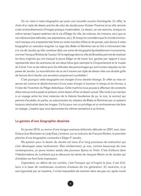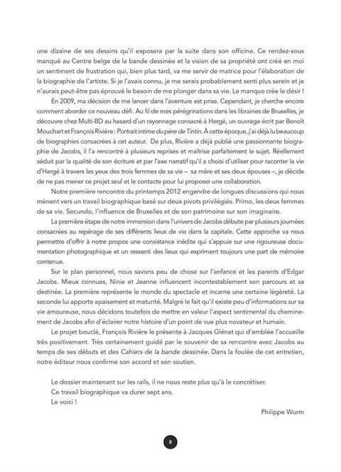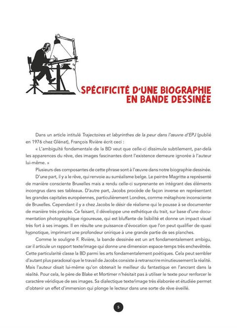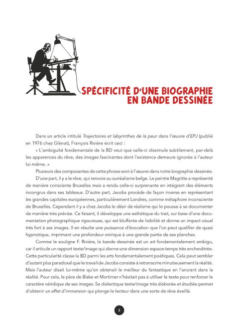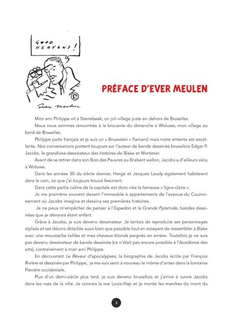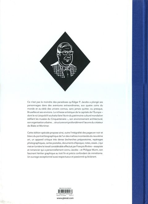 L'aventure dessinéede Edgar P. Jacobs. Amateur d'art antique égyptien, collectionneur d'armes en tous genres, chanteur lyrique amoureux de la scène... Avant d'être le créateur de Blake et Mortimer, Edgar P. Jacobs est un homme d'une grande curiosité, animé par des passions nombreuses qui ont toute sa vie transporté son imagination. Ainsi, à 18 ans, il se rêve davantage en chanteur d'opéra qu'en dessinateur de bande dessinée. Malgré un passage à l'Académie royale des Beaux-Arts de Bruxelles, il préfère considérer le dessin comme un gagne-pain et non comme une véritable vocation. Mais la guerre arrive et dans les années 1940, les Allemands exigent que le contenu de la série américaine Flash Gordon soit repris et modifié. La tache revient à Jacobs qui fournit ensuite au journal les planches de sa première série : Le Rayon U. Plus tard, il rencontre Hergé, l'assiste sur Tintin - sans jamais être crédité - et finit par créer les aventures de deux héros anglais appelés à devenir des incontournables du genre : le colonel Francis Blake et le professeur Philip Mortimer. La bande dessinée est devenue son art et son métier, mais l'histoire de Jacobs ne s'arrête pas là...À l'occasion de l'anniversaire de la première publication des aventures de Blake et Mortimer dans le journal Tintin il y a 75 ans, voici le portrait biographique de l'un des plus grands auteurs du Neuvième Art. François Rivière, qui s'est longuement entretenu avec le maitre de son vivant, y raconte l'artiste au travers de nombreuses et fascinantes anecdotes qui ont constitué la vie de l'auteur belge. Philippe Wurm, l'un des héritiers évidents et revendiqués de la ligne Jacobs, met en scène cette fascinante destinée «à la manière de», d'un trait fin et précis confondant de mimétisme.L'ouvrage se déclinera en deux éditions :Jacobs - Le rêveur d'apocalypses propose la bande dessinée complète en couleurs complétée d'un appareil critique succinct détaillant «l'homme Jacobs».Jacobs - Le rêveur d'apocalypse - édition spéciale est l'édition luxe du même ouvrage, en noir et blanc, enrichie d'un appareil critique très dense (photographies, cartes postales, documents d'époque, notes, essais...) sur les coulisses de la création de l'oeuvre de Jacobs et les recherches effectuées par Wurm et Rivière. Car le moindre des paradoxes n'est pas que Jacobs a inventé des mondes et des voyages extraordinaires, aux quatre coins du monde et au-delà des univers connus, sans jamais quitter - ou presque - Bruxelles et ses environs...