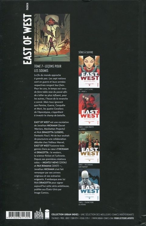 La fin du monde approche à grands pas. Les sept nations sont en guerre et leurs armées respectives rongent leur frein. Mais tous ignorent que Famine, Guerre, Conquête et Mort, les quatre Cavaliers de l'Apocalypse s'apprêtent à investir le champ de bataille. Contenu : EAST OF WEST vol.7 (#30-34).