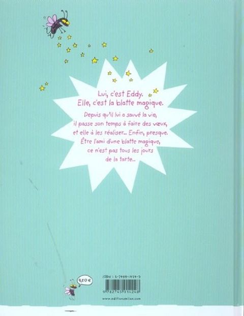 Sur le chemin de sa nouvelle école, Eddy trouve une blatte engluée dans un chewing-gum sur le trottoir. Il a bon coeur et libère l'insecte, et là... Tadam ! En fait c'est une blatte magique ! Pour le remercier, elle lui annonce qu'elle réalisera chaque jour un voeu. Naturellement, c'est le début des ennuis : Eddy n'a pas d'amis, ses parents se disputent souvent, sa petite soeur ne lui rend pas la vie facile... et la blatte comprend presque toujours ses souhaits de travers ! Entre humour loufoque et chroniques de la vie d'un collégien, Lisa Mandel propose un regard tendre et étonnamment profond sur la vie et le mal-être des ados. À ne rater sous aucun prétexte !