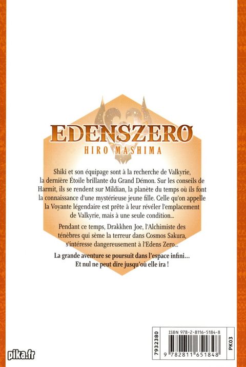 Shiki et son équipage sont à la recherche de Valkyrie, la dernière Étoile brillante du Grand Démon. Sur les conseils de Harmit, ils se rendent sur la planète du temps où ils font la connaissance d’une mystérieuse jeune fille. Celle qu’on appelle la voyante légendaire est prête à leur révéler l’emplacement de Valkyrie, mais à une seule condition... Pendant ce temps, Drakkhen Joe, l’Alchimiste des ténèbres qui sème la terreur dans Cosmos Sakura, s’intéresse dangereusement à l’Edens Zero...