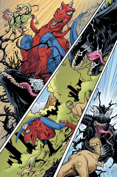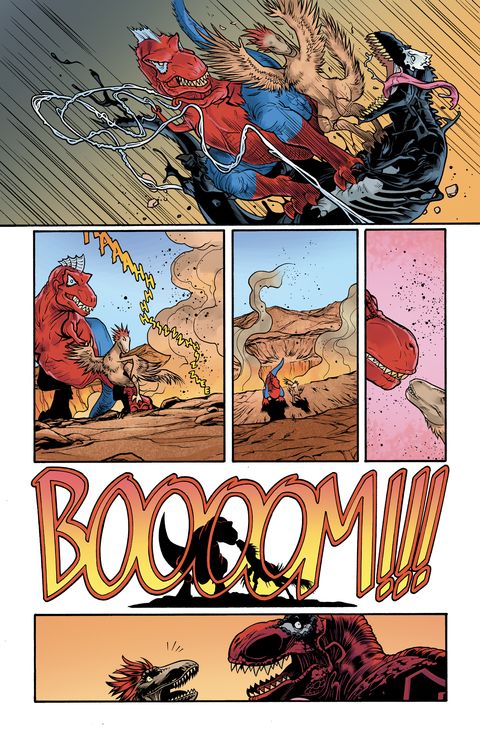 Le Spider-verse regorge de recoins inexplorés, alors, prêt à y retourner pour une nouvelle visite ? Spider-Rex revient et affronte un autre tyrannosaure : Venomsaurus. Billie Morales, la soeur de Miles, reprend du service. On découvre les origines de Spider-Boy, un personnage important apparu récemment dans les pages de MARVEL COMICS et on se pose la question : et si J. Jonah Jameson avait été mordu à la place de Peter Parker ? Les auteurs n'en finissent plus de s'amuser avec les versions alternatives de Spider-Man... et les lecteurs aussi ! Ces personnages sont de plus en plus nombreux à faire leur apparition dans les pages d'autres comics. Cette mouture 2024 d'EDGE OF SPIDER-VERSE mérite le détour et particulièrement pour découvrir le mystère des origines de Spider-Boy par Dan Slott et Humberto Ramos !